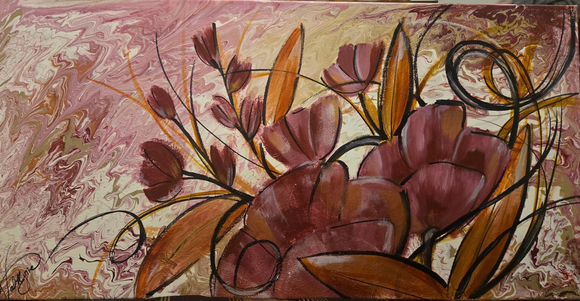 Les fleurs incandescentes surgissent d’un fond métallique et sombre, comme des éclats d’âme qui refusent de s’éteindre.